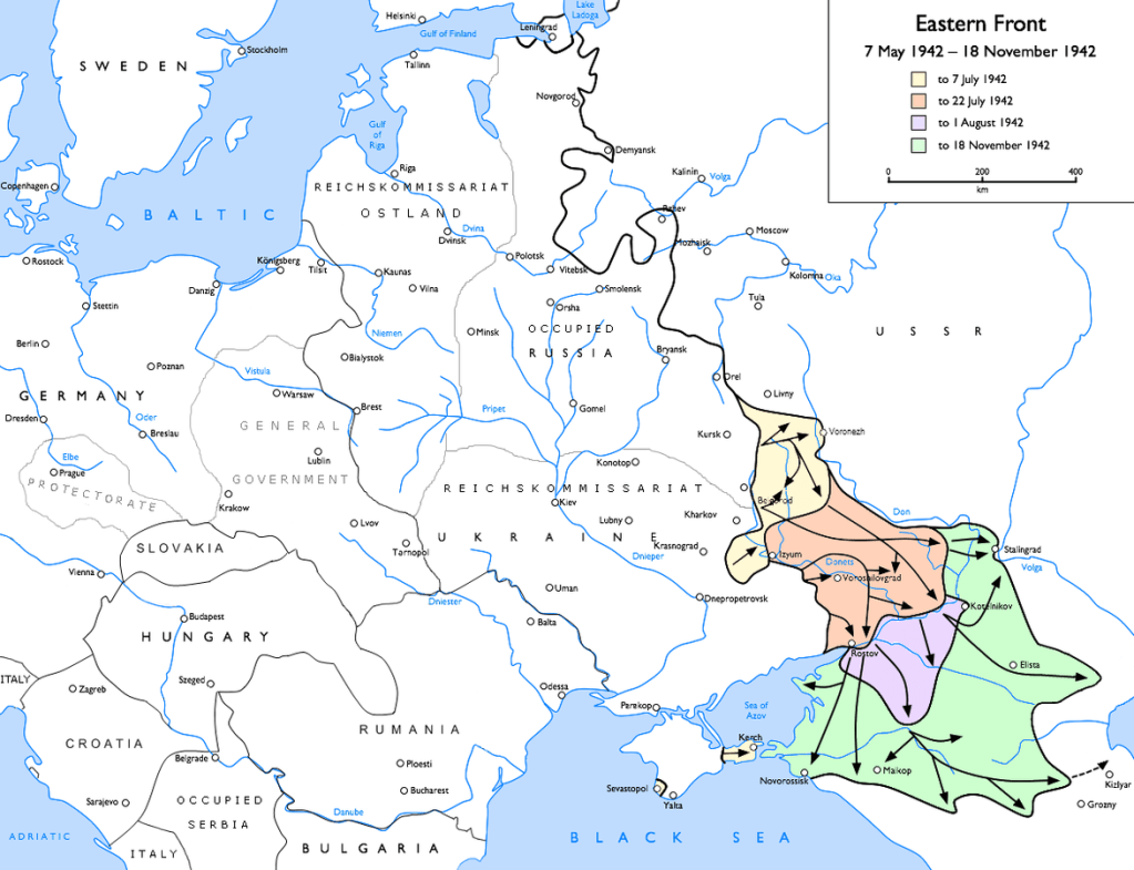 Their offensive resumed in spring 1942, this time down-south in the Caucasus, where the Group of Armies South had taken most of the Ukraine in 1941. Their advance threatened to capture the Baku oilfields, the main source of oil for the USSR.