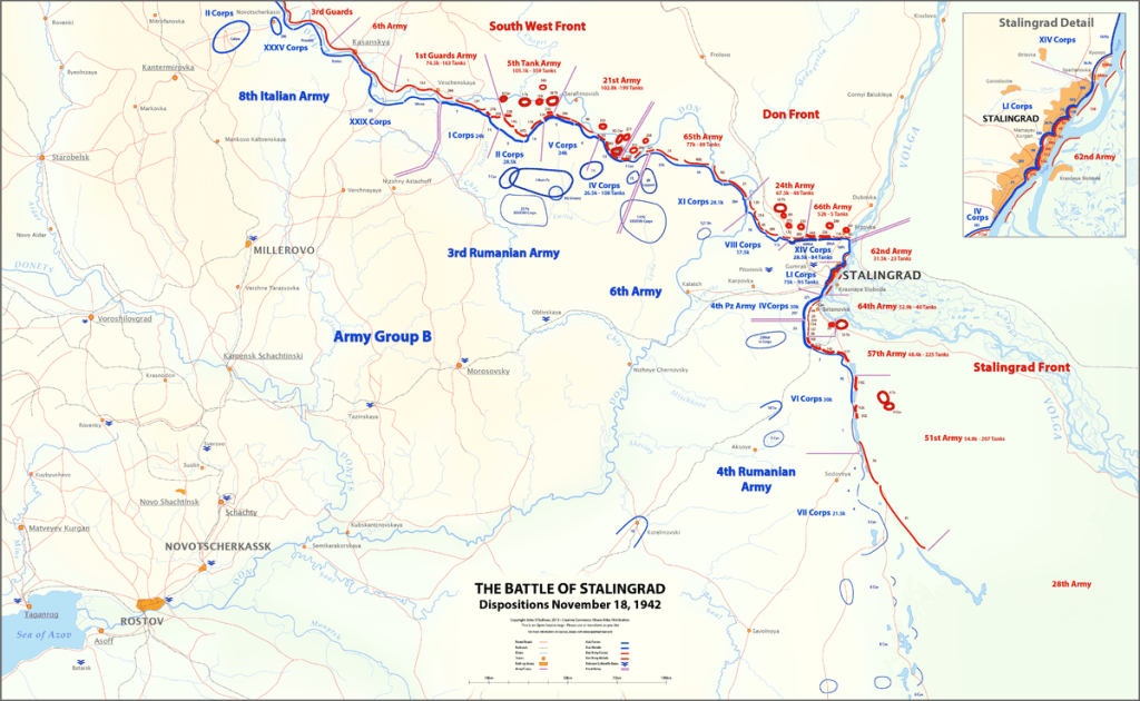 Without anti-tank weapons, and only light tanks to face the fearsome T-34, Romanian and Italian resistance soon collapsed. The Soviet throngs, north and south of Stalingrad, advanced quickly towards their meeting point in Kalach River, driving through behind the German lines, while the Sixth Army, unaware, kept fighting in Stalingrad.