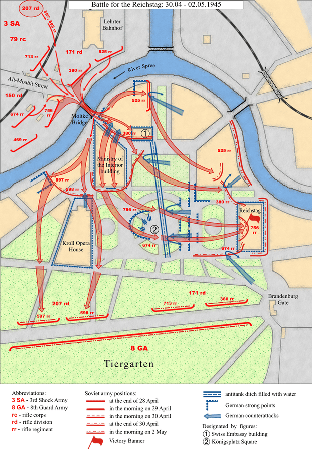 On the 30th of April, 6 am, the first regiments of the 150th rifle division began their final push towards the Reichstag. However, the former German parliament was well defended, and fire from the 88mm guns in the distant Zoo Flak Tower made advance impossible. They waited till the night and resumed their advance. Inside the Reichstag things weren’t precisely easier. The Germans had to be removed room by room, and managed to make an excellent use of the ruins to hide and shoot.