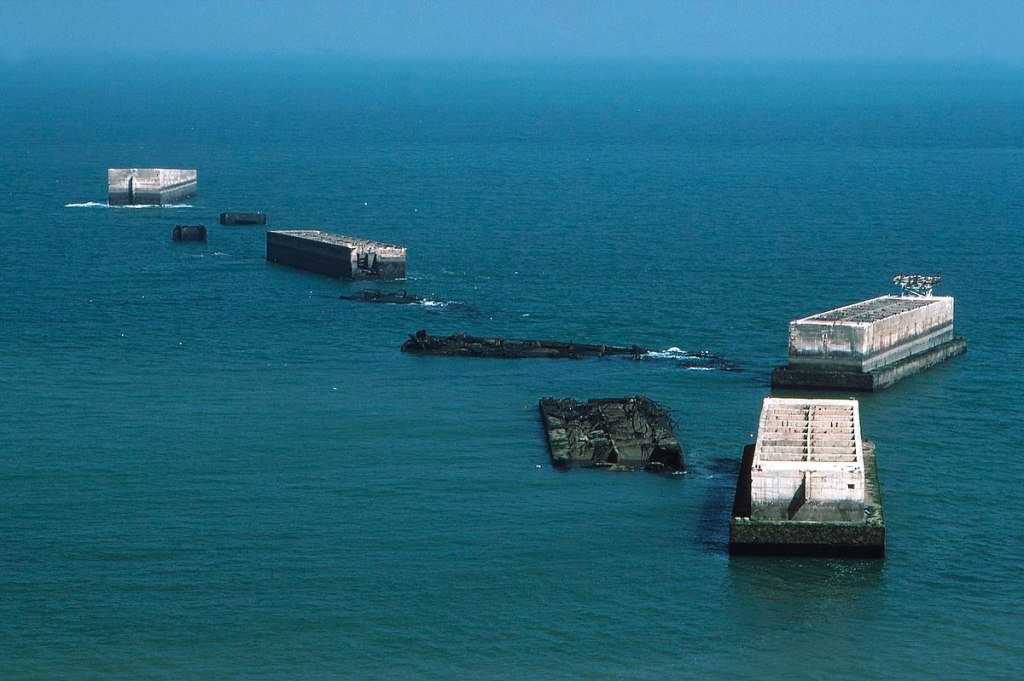 The Gold Mulberry harbour, in Arromanches. Even as today, rests of the harbour such as these breakwaters remain visible. Хрюшa. Source