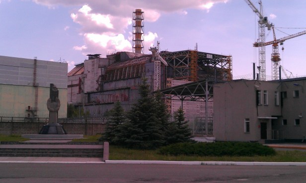 The Sarkofag entombing the remains of reactor 4. This picture was taken from the grounds of the decomissioned Nuclear Plant. The owner is the author of this blog. Taken May 2014