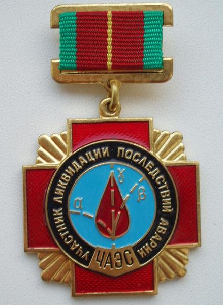 Badge awarded to the liquidators of Chernobyl. It reads: participant in the liquidation of the consequences of the accident. Source