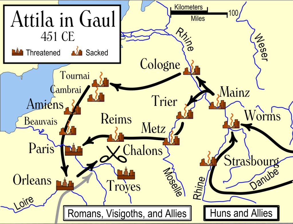 Attila and his multi-ethnic army bypassed Trier, but sacked Metz, before riding into the open expanses of Champagne, an area then known as the Catalaunian Fields. On reaching Troyes, its bishop, Lupus, surrendered the city in order to spare its citizens. From Attila’s lips, the Chrsitan chroniclers attribute the famous statement spoken to Lupus: ‘Ego sum Attila, flagellum Dei’. I am Attila, the Scourge of God. For the Christians, it was easier to believe that Attila was thrashing them because he was the instrument of God’s wrath.